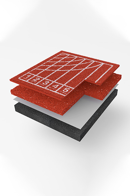 透气型塑胶跑道是由底涂、弹性颗粒中层、面层组成的运动场地。底涂为单组分聚氨酯胶黏剂,与空气中的湿气反应固化;弹性颗粒中层由 PSV-211 单组分专用胶黏剂与 EPDM 颗粒按照 1:6~1:7 的质量比混合后摊铺而成;喷颗粒面层由 PSV-302 喷颗粒面胶、胶粉、EPDM 颗粒按比例混合,搅拌均匀后,喷涂于弹性颗粒中层上固化而成。